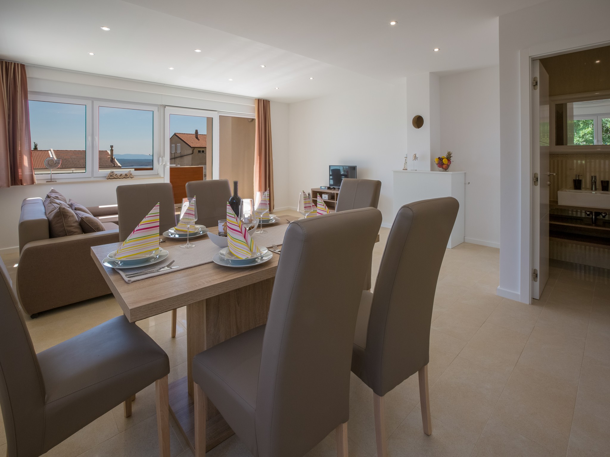 Vrlo ukusno i moderno namješten apartman za 4-6 osoba. Apartman ima dnevni/blagovaonu sa potpuno opremljenom kuhinjom, 2 spavaće sobe i 2 kupaone. Dodatno, apartman ima svoju 15m² terasu.