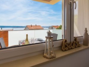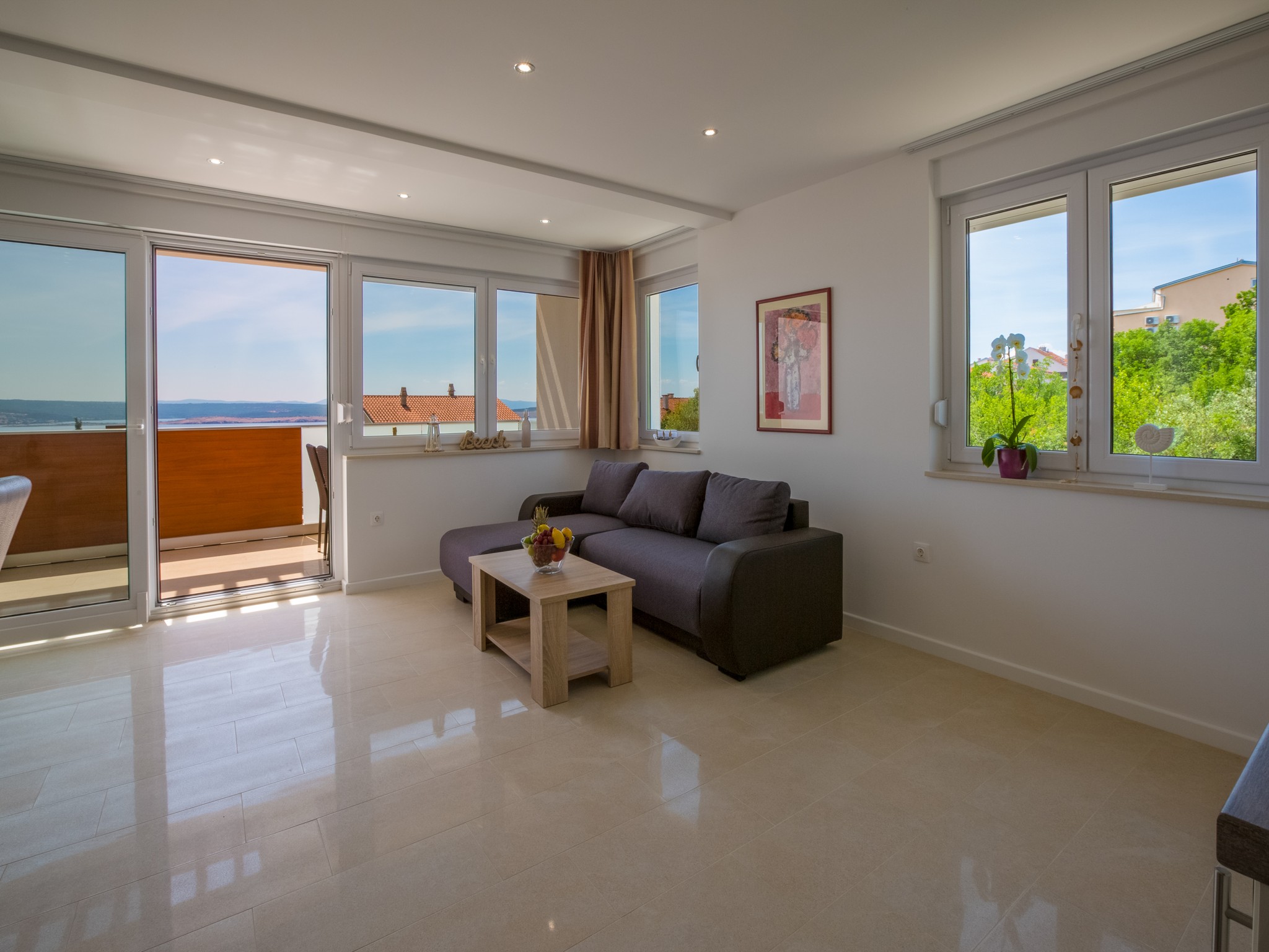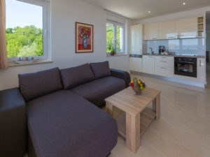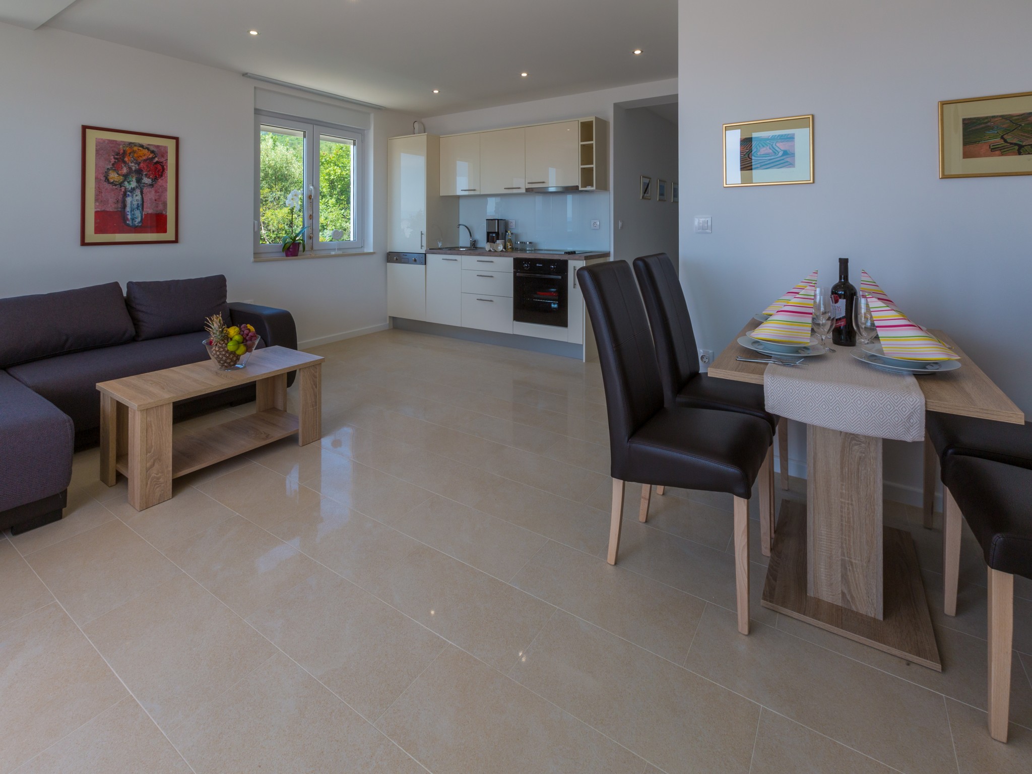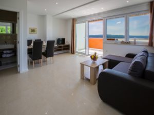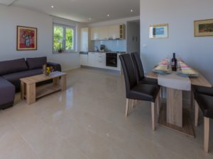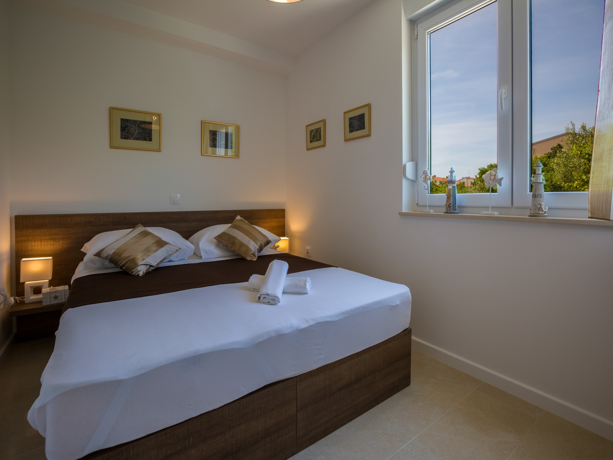Moderni apartman je smješten na prvom katu i može primiti 4-6 osoba. Ima sve što Vam treba za ugodno ljetovanje: dnevni boravak gdje mogu spavati 2 osobe, kuhinja, 2 spavaće sobe sa tuš kabinama i toilet; te vlastiti balkon.